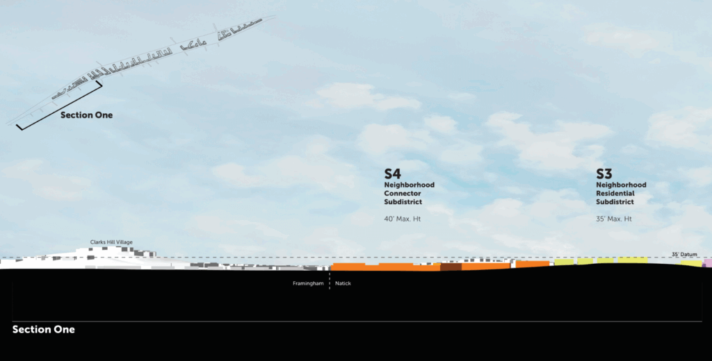 The centerpiece of our work was creating detailed drawings that showed the corridor’s transformation potential. Rather than abstract zoning maps, we developed section drawings that clearly communicated building types, character, and heights within the existing context. These visualizations helped residents understand how height limits would translate to actual development given the topography of the corridor.