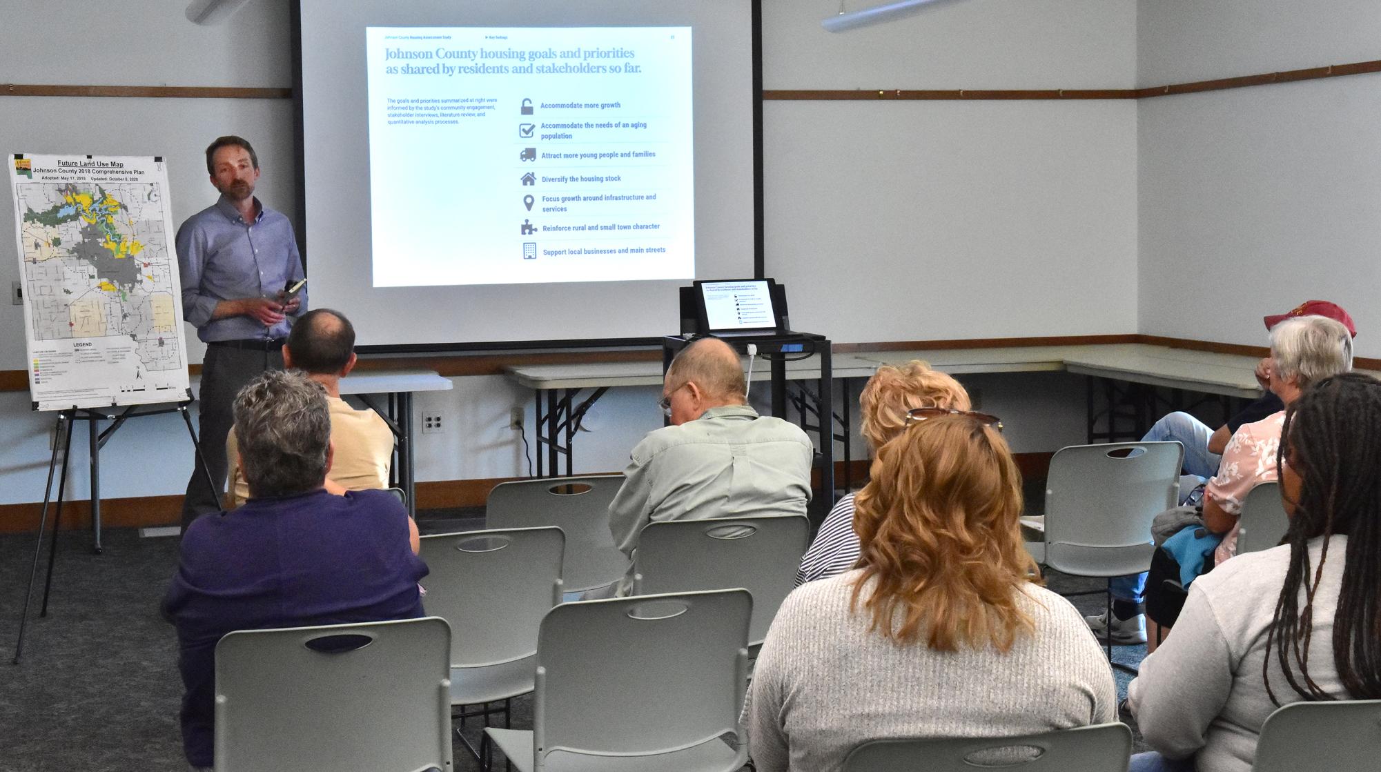 “Jeff Sauser, co-founding principal of CommunityScale, explained to the dozen or so attendees the multi-faceted nature of the report, which includes looking at existing housing stock, what ‘affordability’ means in Johnson County and what the income levels are, if people are able to access the housing they need, and if housing (or the lack of) is an obstacle to other economic development goals.”
